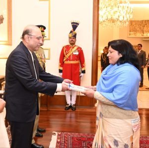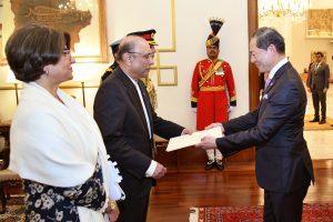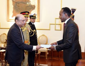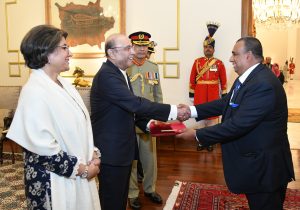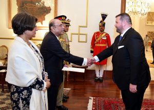 Ambassadors from Romania, Somalia, Nepal, Japan, and Bangladesh presenting their diplomatic credentials to President Asif Ali Zardari during a ceremony held at Aiwan-e-Sadr on 24-12-2024.