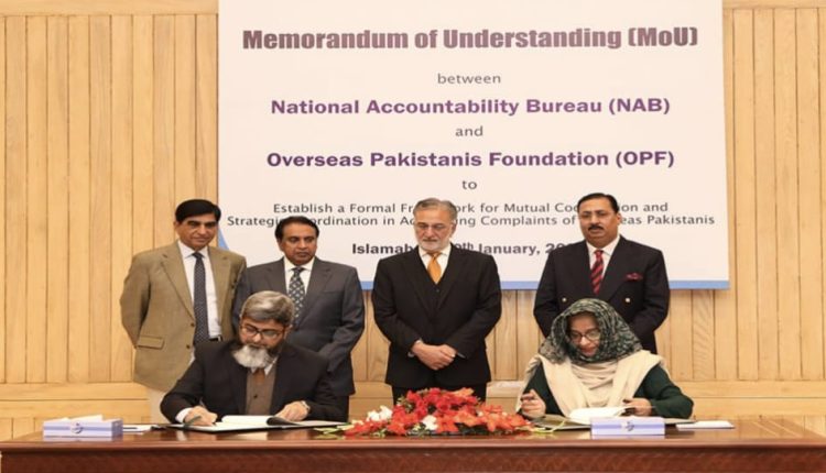 Memorandum of Understanding has been framed between the Overseas Pakistanis Foundation (OPF) and the National Accountability Bureau (NAB) to establish a formal framework for mutual cooperation and strategic coordination in addressing all forms of issues and complaints of overseas Pakistanis, related to property disputes, financial fraud, misuse of authority, and other matter which may require NAB’s intervention.