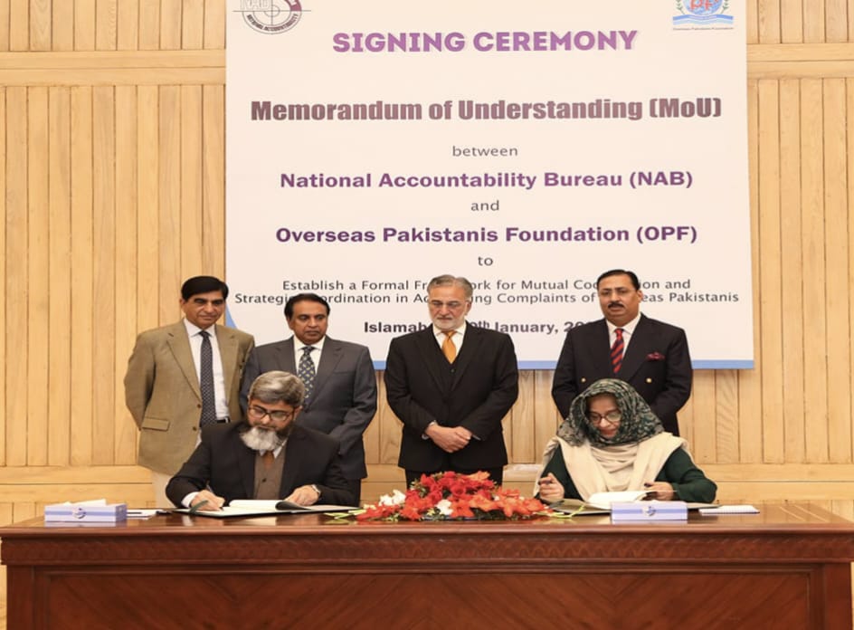 A Memorandum of Understanding (MoU) was signed between National Accountability Bureau (NAB) and Overseas Pakistanis Foundation (OPF), Ministry of Overseas Pakistani & HRD, in a ceremony, today at NAB Headquarters.