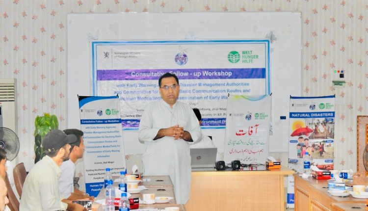 Quetta: Natural disasters are very dangerous for human-being and farmers. Timely preparation and awareness and preparedness is compulsory to reduce financial and crops losses. Government of Balochistan is working to tackle issues, non-government organizations are playing their part very well to educate the farmers and local people in communities. It is our duty to support such initiatives to save our future and livelihood. Said Mr. Hafeez Ullah Khosa, Deputy Director Social Welfare Department District Jhal Magsi while addressing participants of Follow-up Consultative Workshop on Disaster Preparedness, arranged by the Human Organization for Peaceful Environment (HOPE), in collaboration with Welthungerhilfe (WHH), at Jhal Magsi. During the workshop the participants discussed various problems and presented the key outcomes and recommendations of the initial workshop held on May 15, 2025.