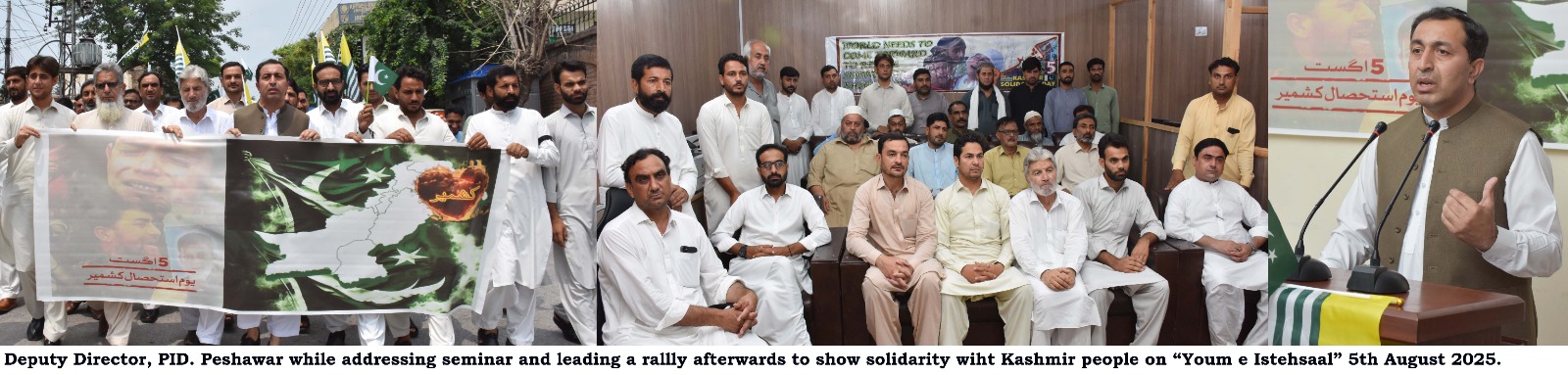 Peshawar, August 5, 2025 — In a solemn expression of support for the resilient people of Indian Illegally Occupied Jammu and Kashmir (IIOJK), the Press Information Department (PID) Peshawar observed Youm-e-Istehsaal today, underscoring Pakistan’s continued commitment to the Kashmir cause. The event was led by Deputy Director Muhammad Hanif and attended by officers, staff of the department and community members.