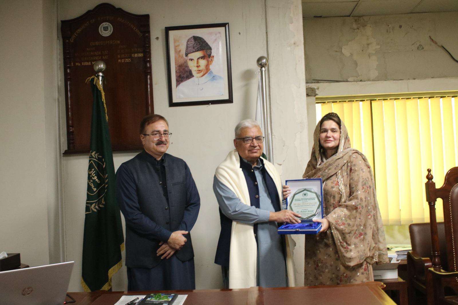 PESHAWAR, Oct. 25: A landmark development in Pakistan’s accountability and grievance-redress framework took place as the Honourable Ijaz Ahmad Qureshi, Ombudsman of Pakistan, paid a historic first visit to the office of the Honourable Ms. Rubab Mehdi, Ombudsperson (Female Mohtasib) for the Government of Khyber Pakhtunkhwa.
