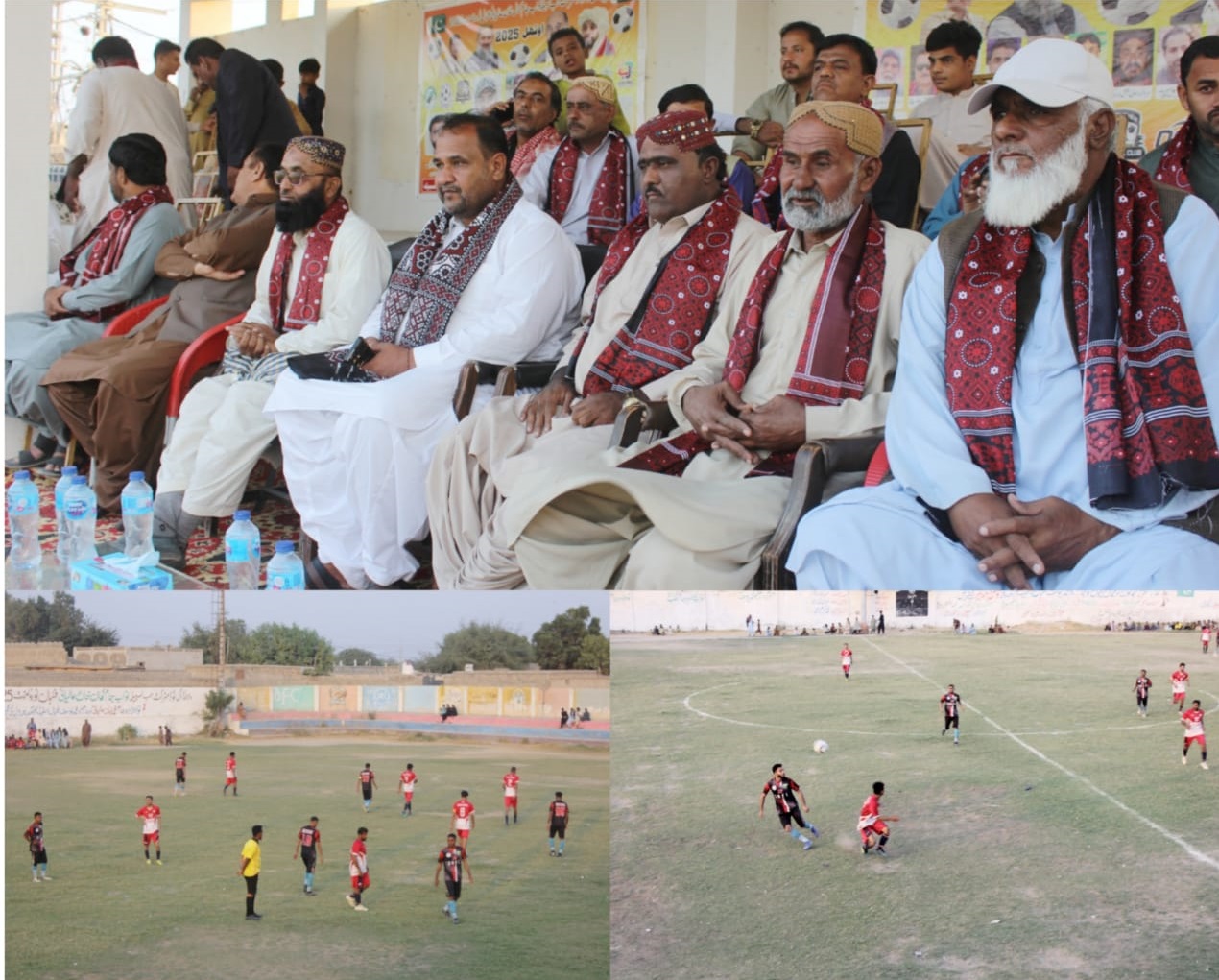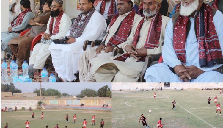 The chief guest for the event was prominent tribal elder and businessman Haji Kareem Bakhsh Elyasani, accompanied by Dam Sonmiani businessmen Jameel Ahmed Qureshi and Habibullah Meerbahar. Upon arrival, the guests were warmly received with flower petals. Tournament organiser Captain Nazeer Shahook presented traditional ajrak, while senior footballer Jan Muhammad Qamar offered flower garlands.