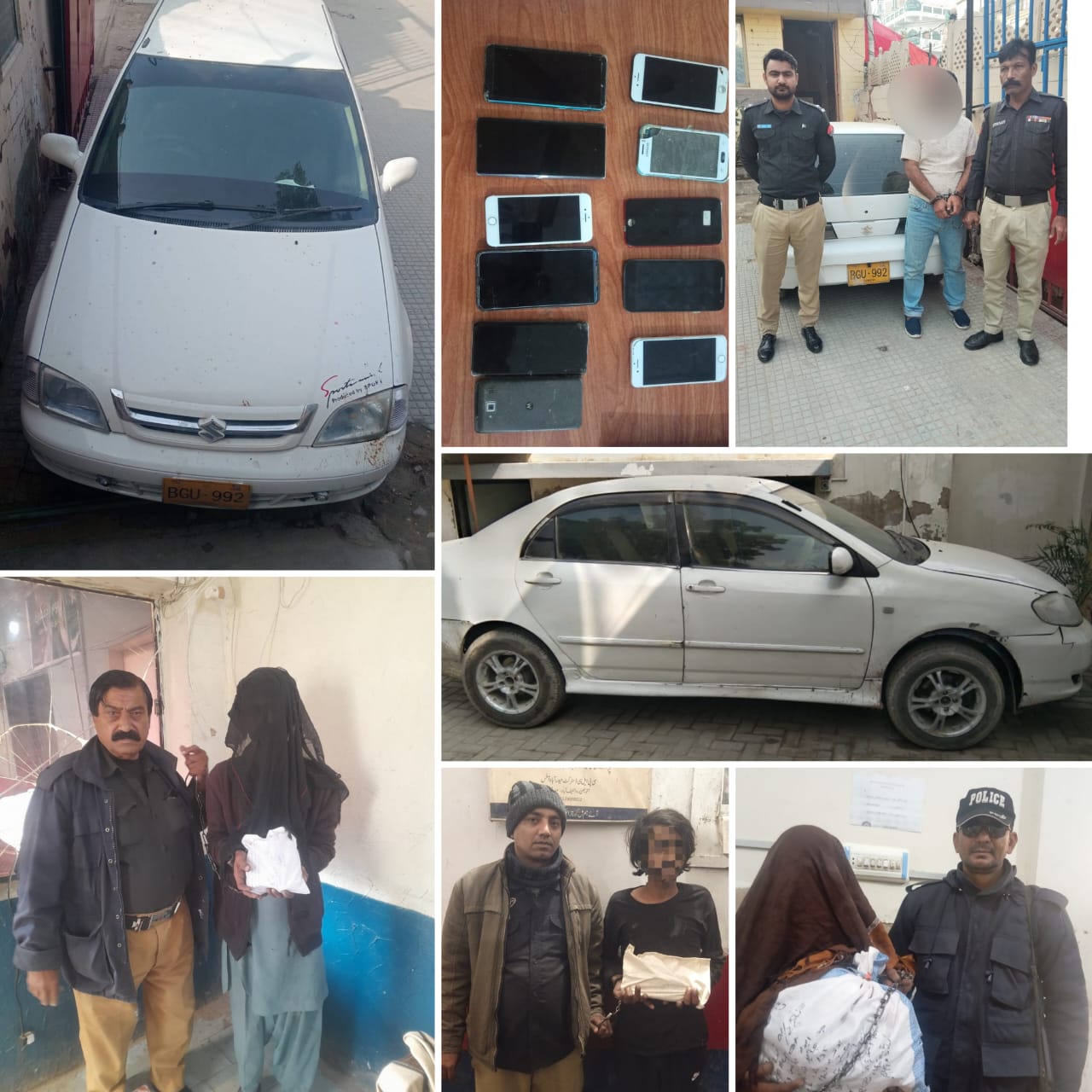 City Police arrested Junaid Qureshi in a car theft case and recovered a stolen Suzuki Cultus along with 11 stolen mobile phones. In a separate action, Pinyari Police detained Farhan Qureshi and seized four bottles of liquor, registering a case under the Hudood Ordinance. Hali Road Police recovered a stolen Toyota Corolla abandoned near the vegetable market and took it into custody.