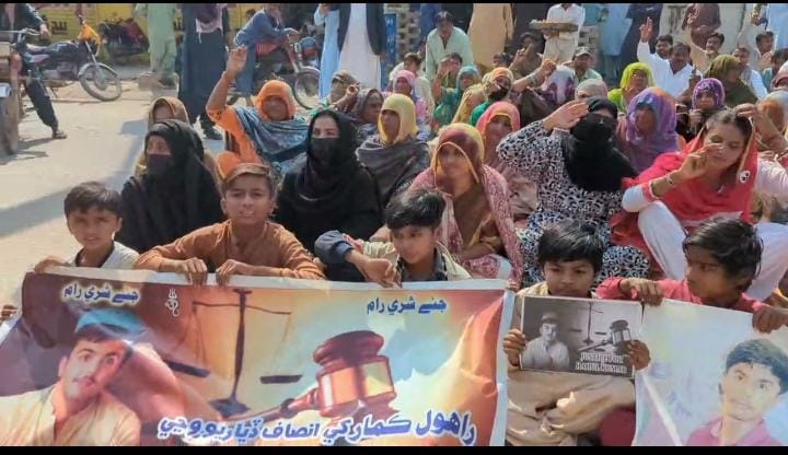 Organized by the Rahul Jandahoro Action Committee, a peaceful rally and sit-in were led by Rahul’s father, Bejal Jandahoro, and mother, Isto Bai, from Haideri Mosque to Sakrand Police Station.